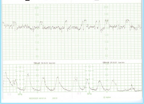 170 B Tiene un MEFI III (variabilidad disminuida + desaceleraciones tardías), por lo que tiene un sufrimiento fetal, que debe ser interrumpido por la vía más expedita. No se puede hacer fórceps, porque tiene solo 8 cm de dilatación. Así que se debe hacer cesárea de urgencia.